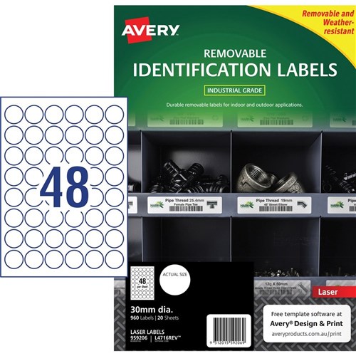 Avery Identification Removable Heavy Duty Laser White L4716 30mm Round 48UP 960 Labels