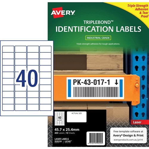 Avery TripleBond Laser Labels Identification White L6140 45.7x25.4mm 40UP 400 Labels