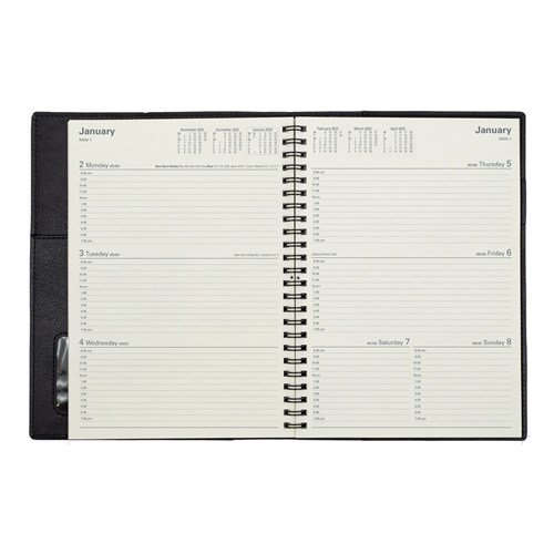 • Ideal for those 'on the move' with its double wiro binding and heavily grained metallic and matt PU cover.