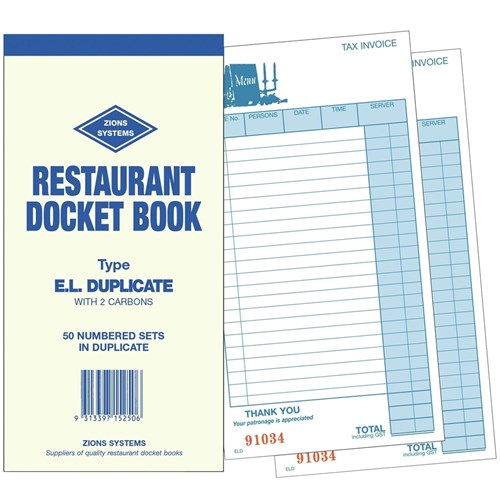 • Zions offers a wide range of single, duplicate, triplicate and quadruplicate restaurant docket books, suitable for all styles of bistros, cafes, restaurants and take-away outlets.